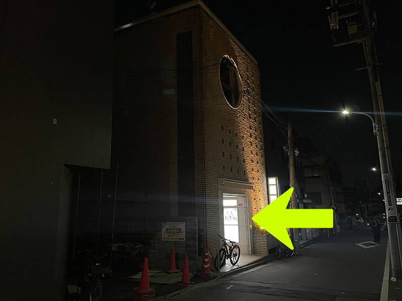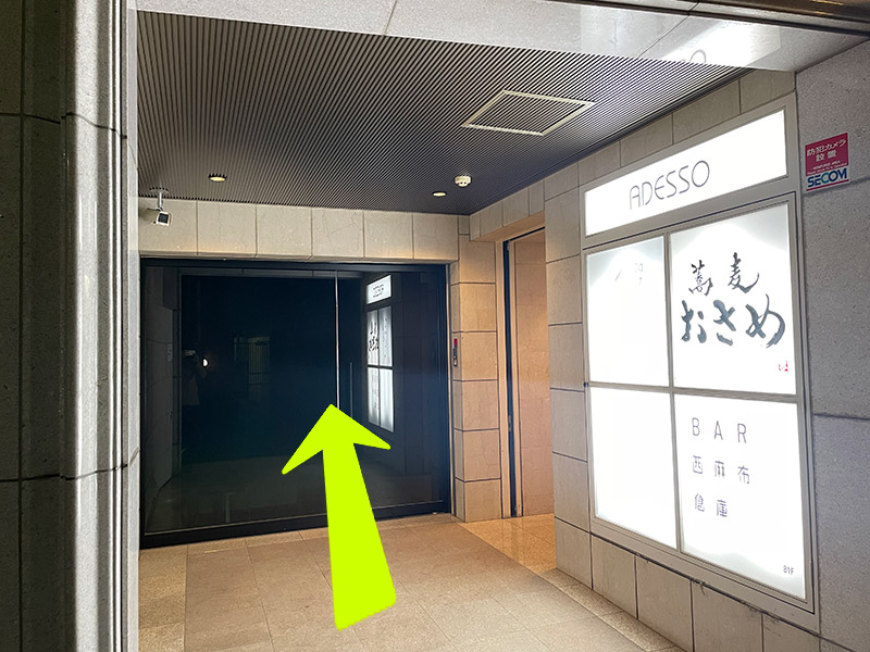 - ③ こちらの1F、黒いガラス扉を開けてお入りください。